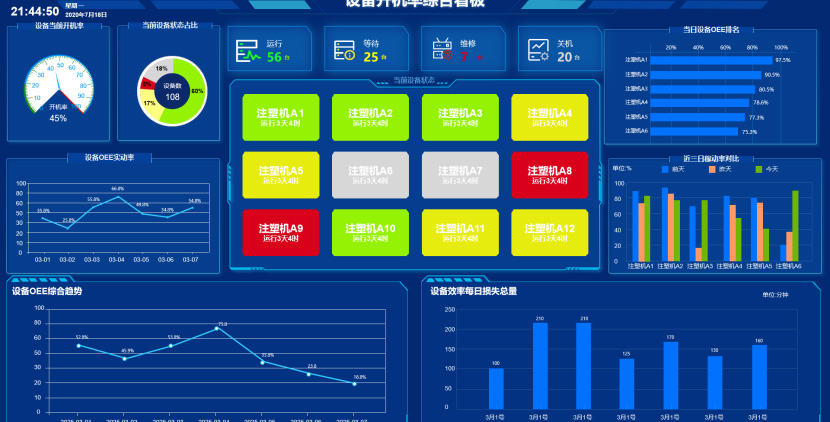設備綜合看板集成展示:實時設備狀態、OEE綜合效率(含實動率及趨勢分析)、每日效率損失統計、當日OEE排名及近三日稼動率對比數據。