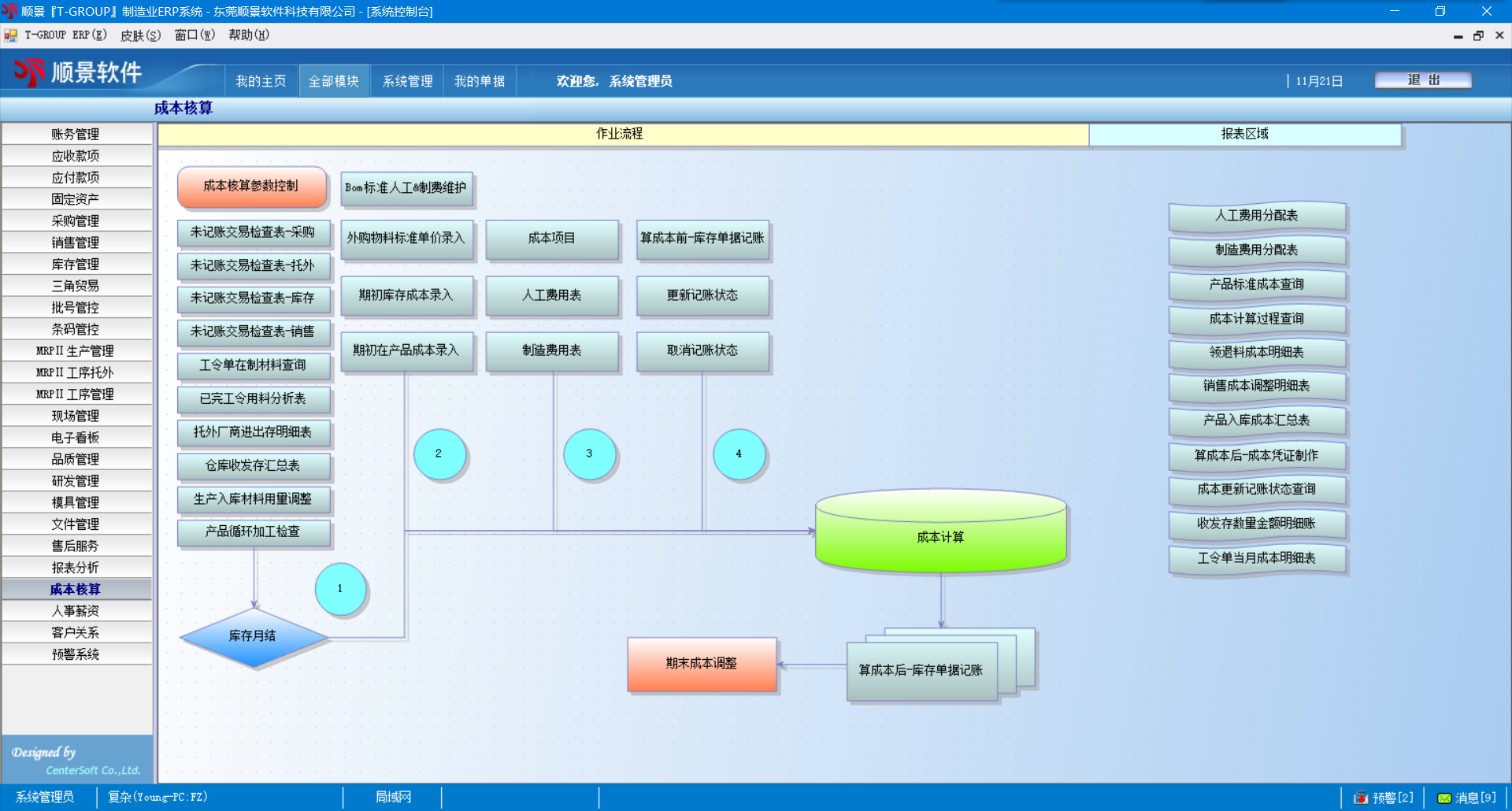 1.    每月在前部單據稽核完成后,點擊一下“計算成本”按鈕,所有成本計算工作皆由系統自動完成;
